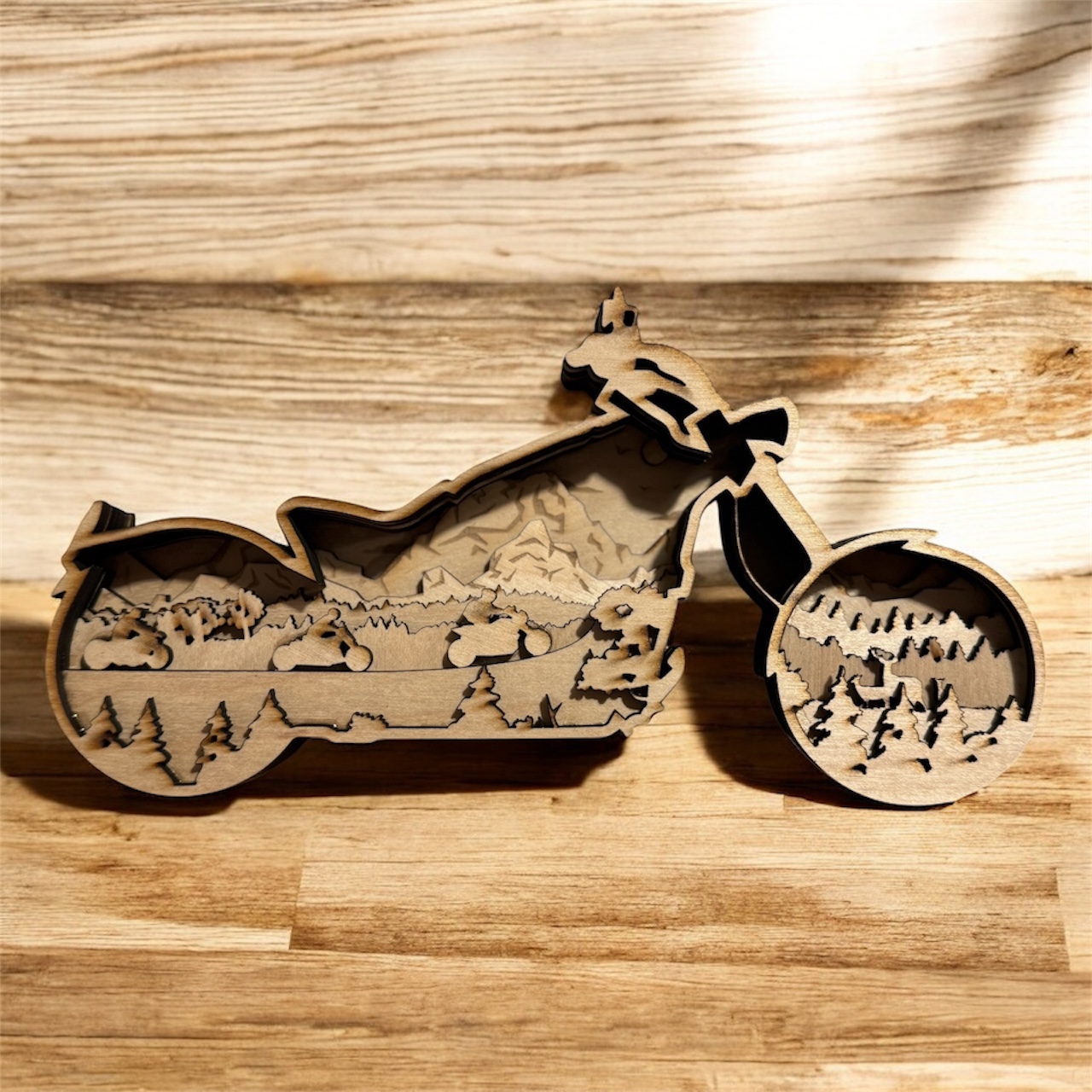 Das Motorrad besteht aus insgesamt 7 einzelnen Schichten gelasertem Sperrholz in 3mm Stärke.