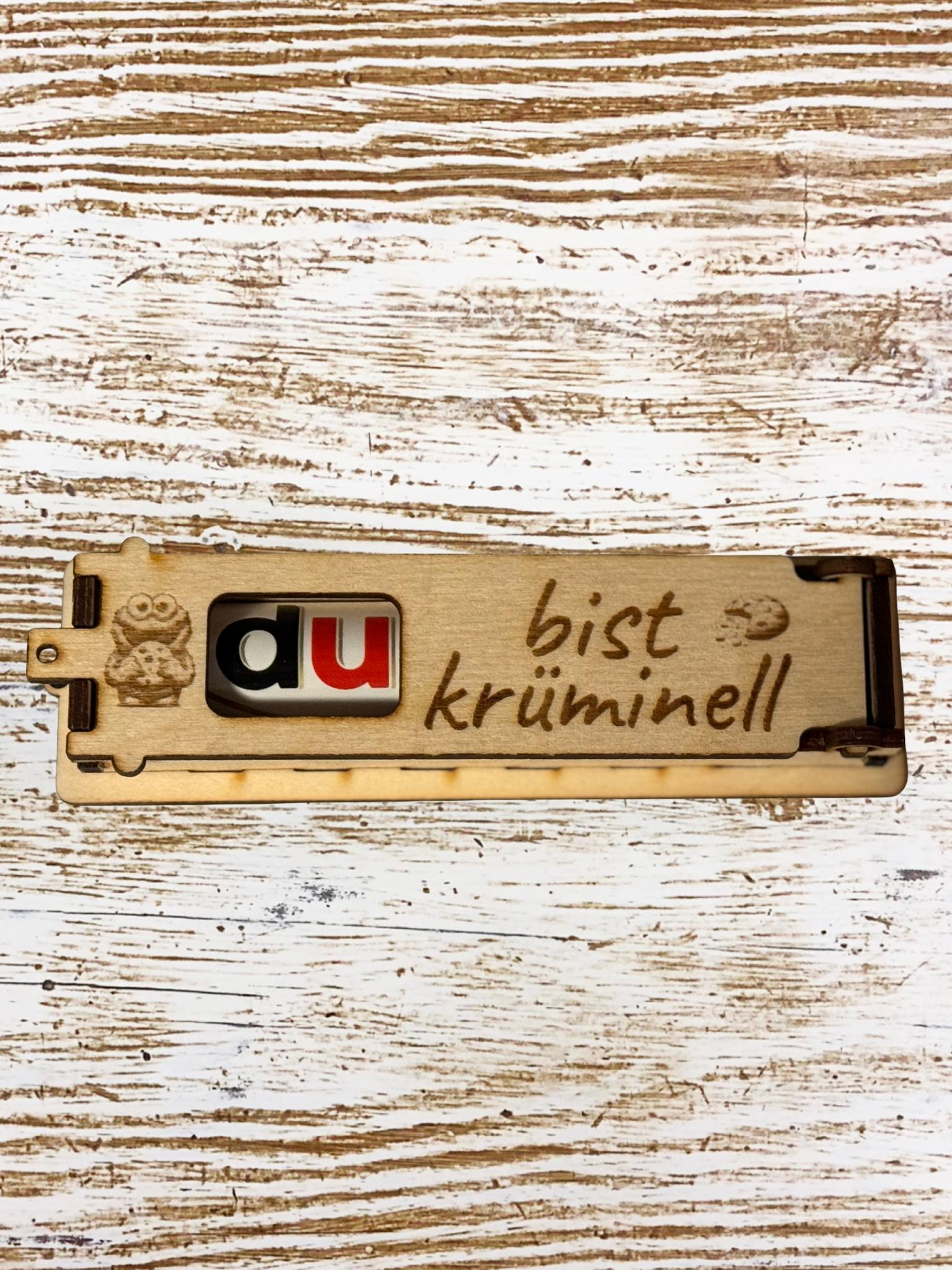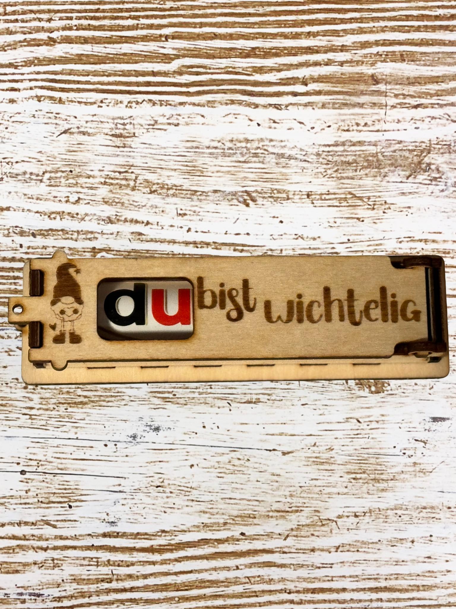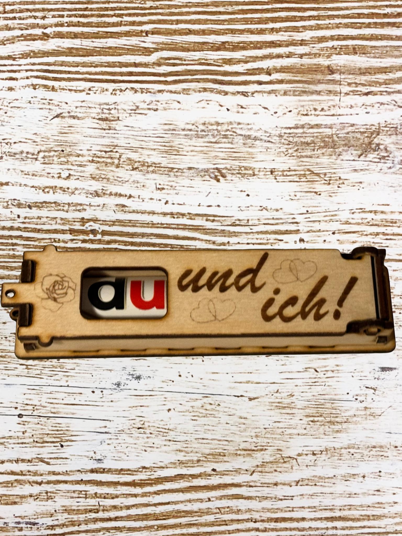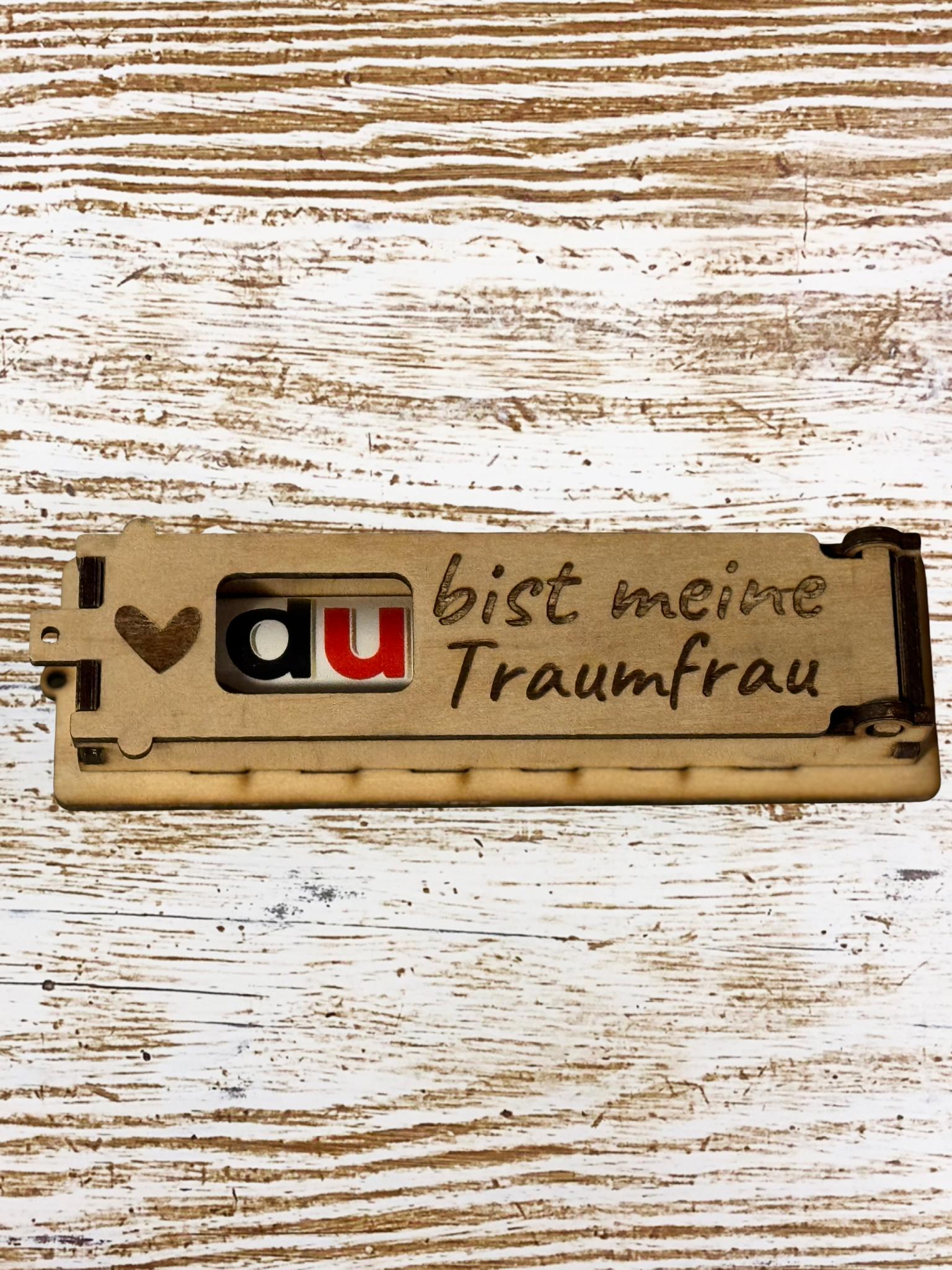 Schreiben sie einfach in das Feld "Wunschname", ihren Spruch, welchen sie gerne auf der Schachtel eingraviert haben möchten. (Bitte beachten sie nicht zu viele Wörter zu benutzen da der Platz natürlich beschränkt ist.)